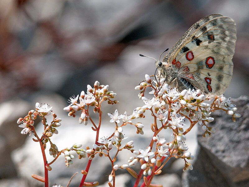 The Moselle Apollo butterfly prefers dry, warm and rocky habitats, such as stony southern slopes and old vineyard walls, as large quantities of the white stonecrop still grow here. Unfortunately, the population of the butterfly has been declining massively since 2012, which is why it is a strictly protected butterfly species.